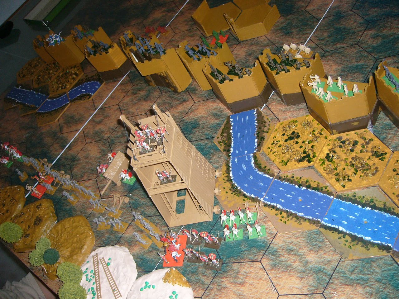 La torre de asalto por fín llega a las murallas, despliega su pontón y los legionarios de la primera cohorte se lanza contra los defensores de la muralla, mientras los auxiliares ligeros avanzan protegidos por los pavés para ostigar a los hebreos, intentando dificultar su defensa. El propio Vespasiano avanza protegido por la torre infundiendo animo a los asaltantes.